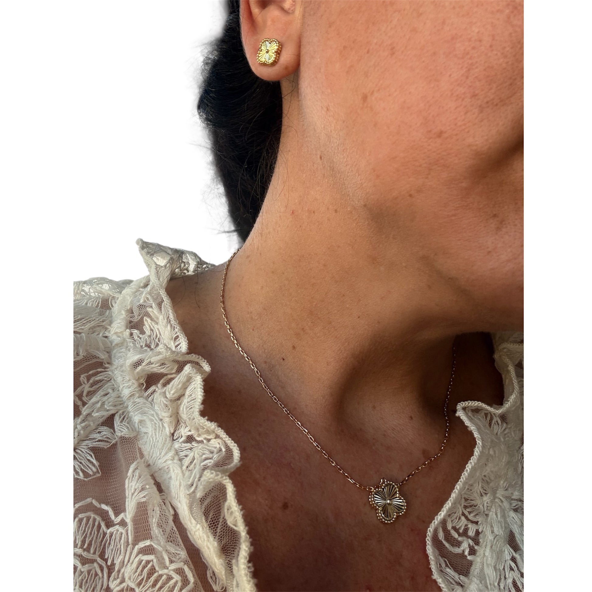 Set de flor, cadena y aretes de colores combinado en gold
